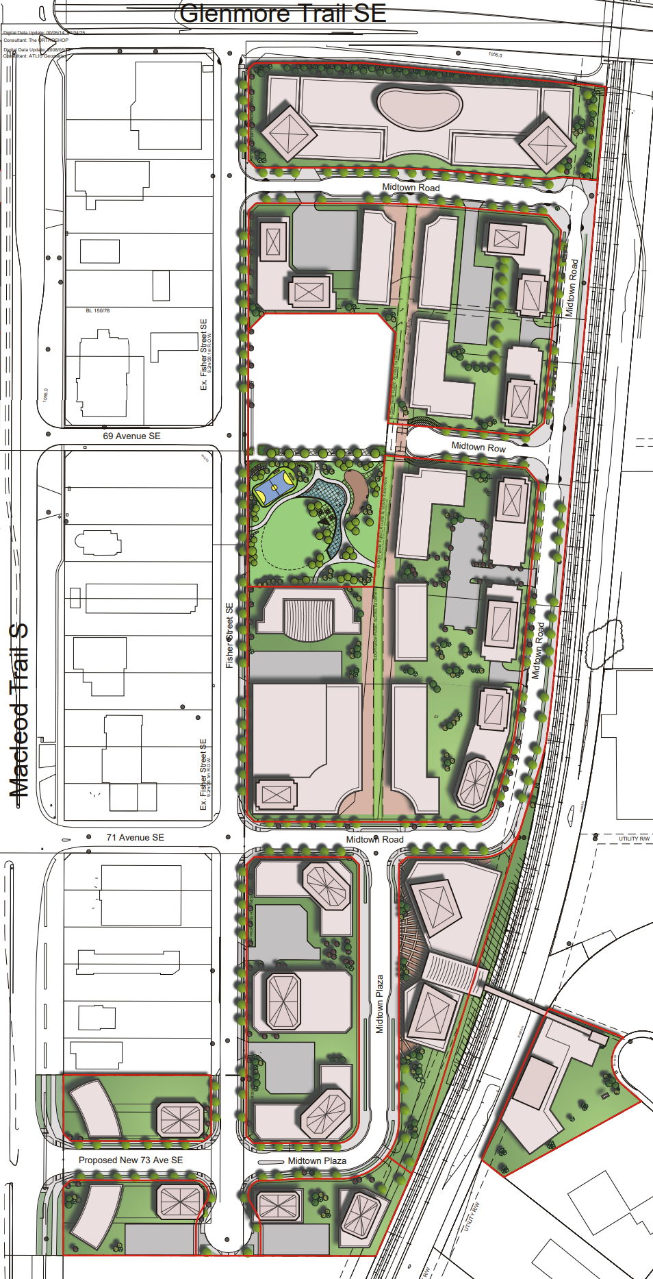The proposed redevelopment is located on 14.02 hectares (34.65 acres) of land along Macleod Trail between Glenmore Trail and 73rd Avenue SE and west of the LRT/CPR corridor. Single ownership allows for the realization of the comprehensive vision for Midtown Station, which considers the new LRT station to be fully integrated within the development.
